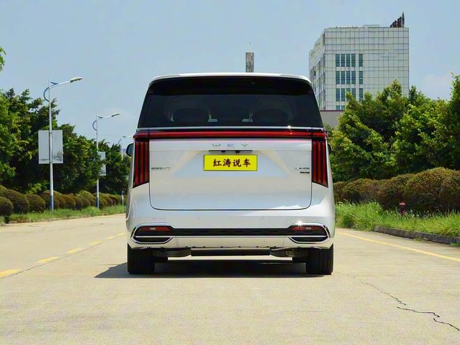 全新魏牌高山7的尾部高大立体,车顶末端有小型扰流板,红色贯穿式尾灯拉宽了视觉效果,两侧还有纵向布局的灯组,点亮后辨识度高,后包围应用了镀铬材质来提升精致感。