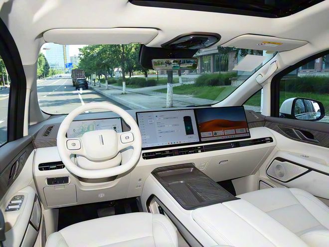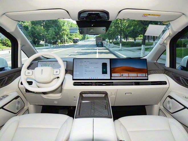 内饰方面,营造出简约和科技氛围,车内使用大量软性材质覆盖和真皮包裹,采用电子怀挡机构,多功能方向盘有加热功能,配备了12.3英寸液晶仪表、26英寸HUD抬头数字显示、15.6英寸中控屏以及15.6英寸副驾娱乐屏,搭载Coffee OS车机系统,内置高通骁龙8295芯片,支持语音六区域唤醒识别、语音连续识别、手势控制、多指飞屏等,还拥有64色主动式环境氛围灯、23喇叭扬声器、50瓦手机无线充电、流媒体内后视镜等。