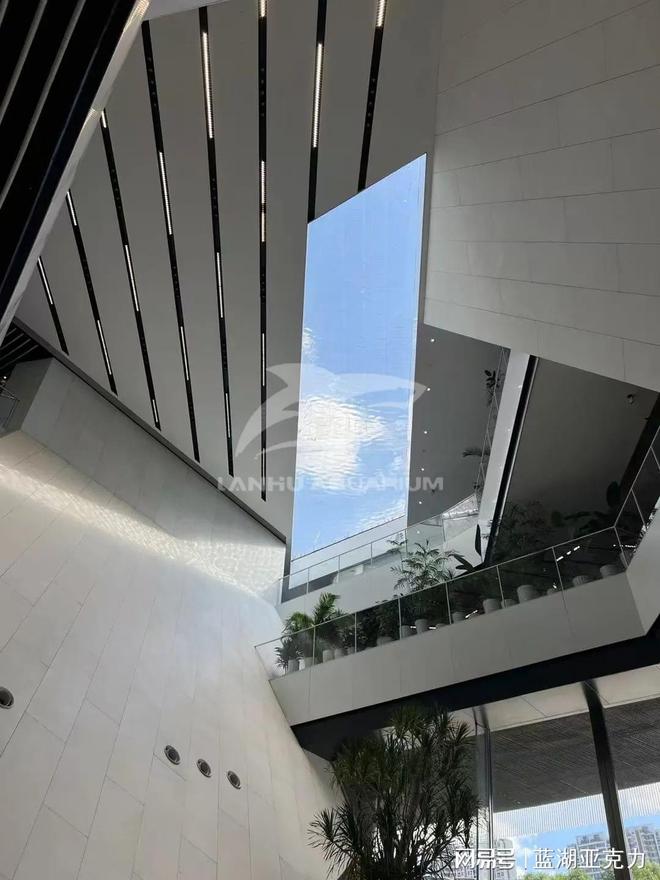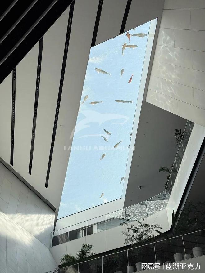 当你驻足当前抬头仰望,天空上方亚克力筑造的透明鱼池,鱼儿在其中自由穿梭,这一刻建筑不再只是冰冷的建筑,而是自然与科技共融的沉浸式场所。